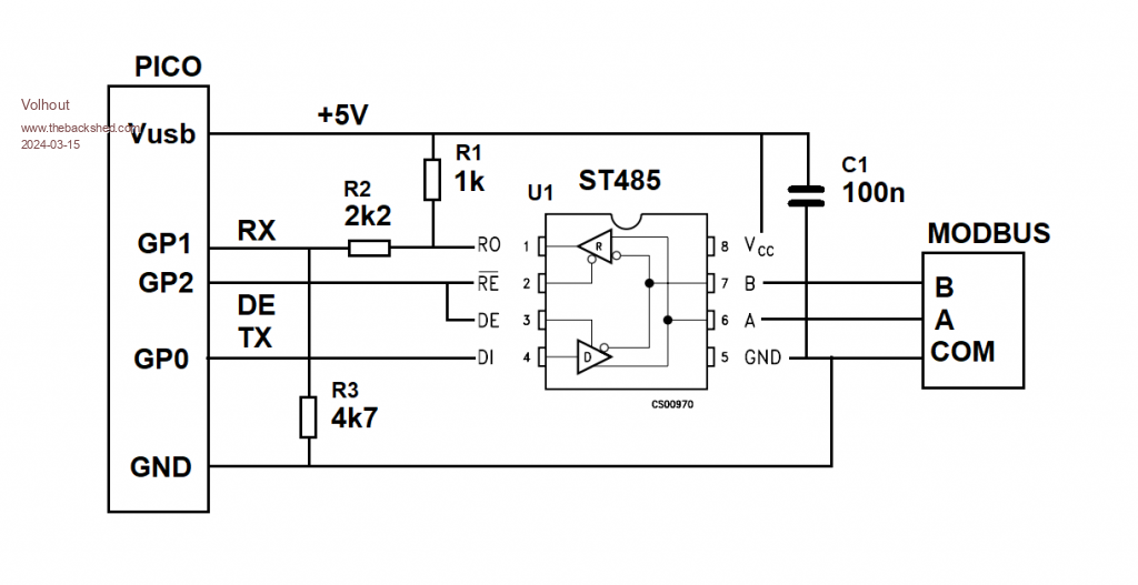 Snoopy runs on a picomite. Connect a 485 driver chip (i.e. MAX485) to COM1 of the pico (GP0/GP1) and connect RE and DE pins to GP2. Same as shown in the first post.