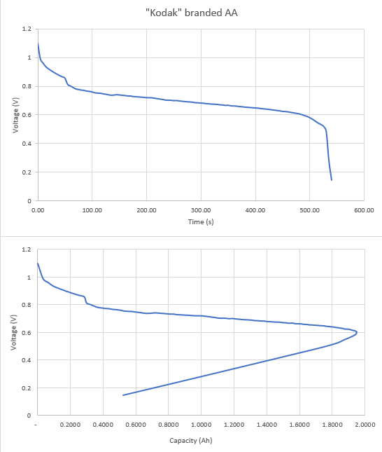 But battery "capacity" is given in mAh - so we calculated that from the data (second chart) - and you can see that this peaks at just shy of 2000mAh (1950mAh from the data) - this occured at 485 minutes, just as the first chart goes non linear.