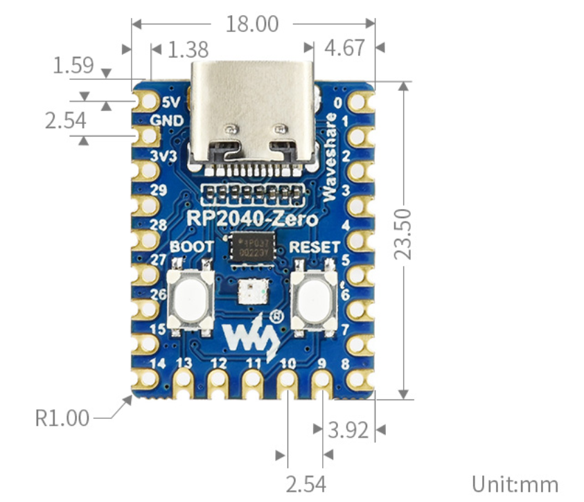 Mine are almost like your photo, although they are not Waveshare branded. Note that the bottom row from 14 down to 8 are all on 2.54mm centres and that you can't easily surface mount this board as the RP2040 is mounted on the bottom.