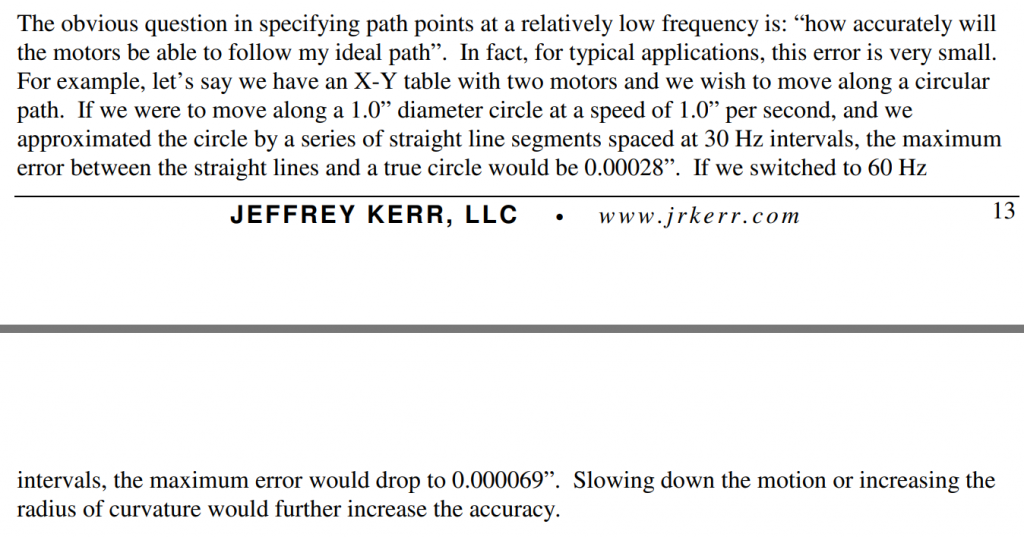 I reviewed the thread and remembered that this is what I responded to. FYI, even though the H7 handles 4 axes with ease, a 1KHz loop-rate is actually overkill for most applications. Dropping to 500Hz is not even noticeable and servos vastly outperform dumb/blind steppers. At SETTICK 2, the H7 can handle more axes. Quite astounding for a Basic interpreter. As I remember, you once asserted that a velocity profile generator was unnecessary because the PID took care of this? No it absolutely does not. The PID's sole purpose is to keep the servo on track and to minimize following error. Edited 2024-04-13 08:36 by PhenixRising |