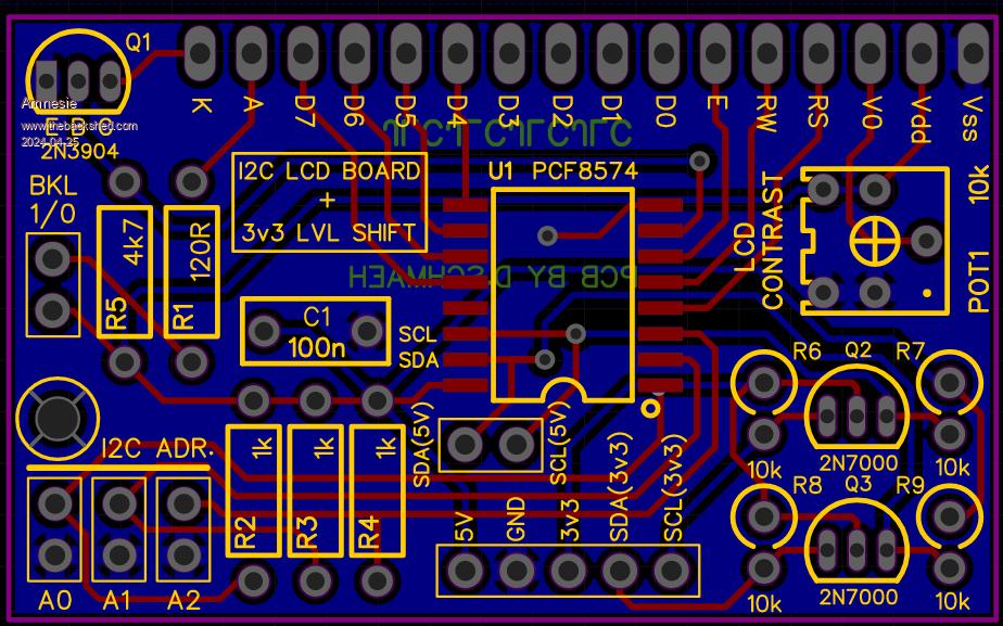 Hello Chris, the circuit is adapted from the original: ![]() But I have added a level shifter for 3v3 operation, since the picoMite demands 3v3. There is also an additional resistor "R1" (120R) which can be adjusted to your likings, since I found the original is way too bright (and if you don't use PWM this can be a good starting point). Main focus (besides 3v3) was to get rid of all SMD package components... except the PCF8574 of course. I've ordered some @ JLC yesterday and will report back if everything works. But I tripple checked the layout, should be fine. Greetings Daniel |