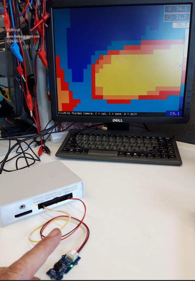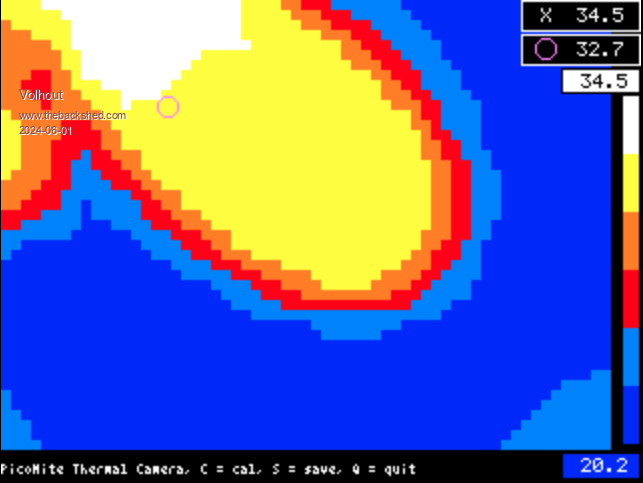 This is the status quo of the PicoMite Thermal Camera. - 0.5 sec update rate (@252MHz CPU speed) - "s" will make a screenshot - 2 markers (X=higest temp, O=centre pixel) - "c" zero's the screen (*) Code MLX90641_dev_09.zip The code is compatible with VGA and ILI9341 320x240 LCD. Control is through keyboard ATM. Support for Game*Mite controls and filesystem is next on the list. Unit in operation (VGA), my finger is in front of the camera module. I use a Seedstudio Grove IR camera module with MLX90641 with 110 degrees opening angle. Final design will use the 60 degrees opening angle part (software compatible). This message is short, because my long message took too long, and I was kicked out of the forum, and lost all the message. Volhout Edited 2024-05-31 21:56 by Volhout PicomiteVGA PETSCII ROBOTS |