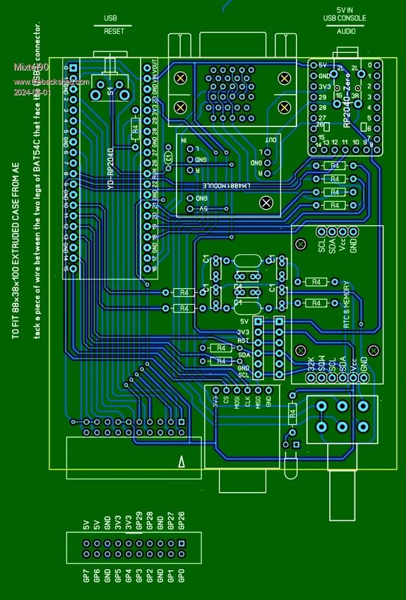 This idea was sparked off by a comment from Vegipete. Cases were being discussed and he came up with this in this post. ( AliExpress link ). I thought, why not? I incorporated the RP2040-Zero USB-PS2 converter this time, purely because I wanted the space that's available underneath it. This is the one suggested by Hawk in this post. It's possible to use a second PCB in the top slot of the case, but you have to be careful because of component heights. I've come up with a design that duplicates the GPIO port using a second RP2040-Zero connected via the system I2C bus. That takes up the front half of the PCB. I don't have a use for the rear half yet, but height is very restricted. Mick Zilog Inside! nascom.info for Nascom & Gemini Preliminary MMBasic docs & my PCB designs |