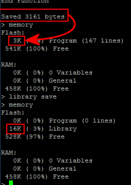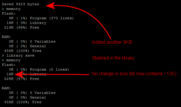 my question should be fairly obvious (and maybe has an obvious answer): Why has 4K of library space jumped to 16K on the MMX? Maybe the architecture of the 32MZ CPU can only talk to flash in pages of 16KB or something, but VAR SAVE of a variable only bumps FLASH by 1K. LISTing the library only renders the original ~3KB of text and it all runs fine, so it isn't a problem as such.