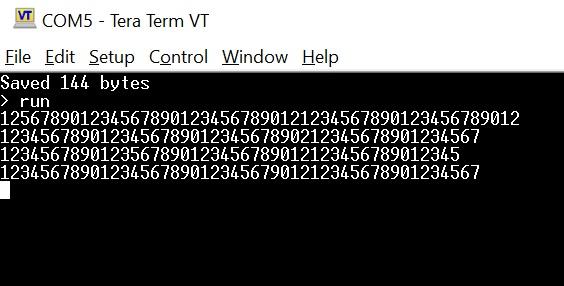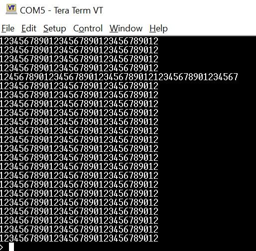 Then I programmed PICO#0 to wait for a min of 32 bytes to be received from PICO#1 using LOC(), it inputs everything from the receive buffer using INPUT$(70,#5) (the 70 is there so it'll read up to 2 strings just in case) and to send everything it receives to TeraTerm at 921600 baud. So on the screen it should display 1 line of 32 characters each second.