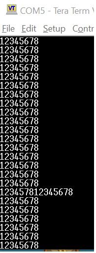 Note that I use the first inp$=INPUT$(70,#5) line to clear the input buffer before waiting for the next 32 bytes. I use 70 in both INPUT statements since the INPUT command reads what's in the input serial buffer even if it's less than 70. 70 is large enough to allow for over two 32 byte strings. What I get is the occasional hiccup. I let TeraTerm run continuously and at random times I see the following: