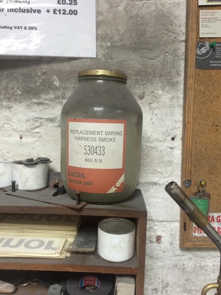 LOL!!! Never seen that before, and I work on the old BMC cars and Lucas electrics most weekends. Smoke makes things work. When the smoke gets out, it stops! |