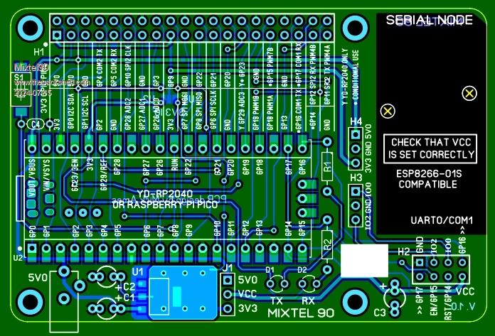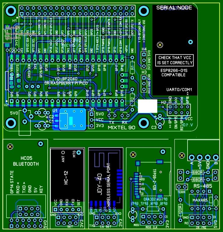 This isn't specifically a MMBasic platform, but it could be used as such. It could just as easily run python. Basically it's a Pico (or clone) attached to a ESP8266-01S socket. The GPIO port can get it's 3V3 supply from the Pico or from an on-board regulator, which can also power the ESP socket. I called it a Serial Node because I think its main use would be as a distributed IO system, using wired or wireless networking. The system bears an uncanny resemblance to a Raspberry Pi for some reason. :) It will probably accept the same "hats" mechanically but you need to sort out your own software support. The GPIO pins are functionally the same in most cases. The ESP socket can be used with the ESP8266-01S or with any of a range of adapter boards for other serial devices. If the board is used stand-alone there is an option to fit a microSD socket in this position. If you have a CMM2 fitted with a ESP8266-01S then this would make an interesting remote IO module for it. Once again, I'll sort out gerbers etc. if people are interested. I have the following additions in mind: A VGA / PS2 / microSD "hat" to make it into a usable VGA platform. A VS1053 audio "hat" which can be used as well as the above. Possibly some sort of local IO "hat" for the unused pins. Another module for I2C connection. Another module for multi-drop COM connection. Mick Zilog Inside! nascom.info for Nascom & Gemini Preliminary MMBasic docs & my PCB designs |