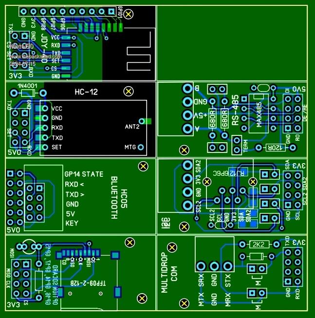 Still playing... :) I've changed the JDY-40 and HC-12 to make them the same size as the others. The HC-12 will now take the module surface mounted. The JDY-40 has moved to the top of the adapter and has a 10-pin connector to bring its parallel port out. There is now a multidrop COM module that can be master or slave. There is now a I2C module with I2C2 on terminals and both I2C ports on a RJ-12 socket to match the Pineapple Pi. There are links for all pullups. A set of adapter modules now fits nicely on their own board and there is one spare position in case I think of something else. IR maybe? Suggestions? The VS1053 is proving to be a little bit of a pain as I'm now eating into the pins a bit. I was trying to keep the ADC pins all free if possible. We'll see... Mick Zilog Inside! nascom.info for Nascom & Gemini Preliminary MMBasic docs & my PCB designs |