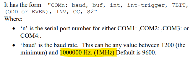 FYI: I don't know if I have somehow missed the latest manual but mine still shows: ![]() I have tested to 3MBAUD...The H7 won't recognize anything faster. |