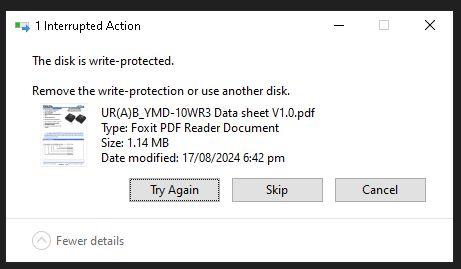 2. the Write Protect flag was set due to an error condition. This can be reset under Windows with “diskpart”: