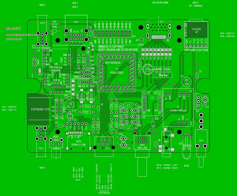 Alpha is now up and running! The audio filter is a kludge as I'm waiting for components. The second port of the I2C connector can't be used (it's on GP8/GP9 and needs moving) The supply to the USB hub needs a proper connection instead of patch wires. There are several missing caps The Reset button is missing (I have one somewhere) THe vertical USB sockets are missing (on order). The ESP8266 hasn't been implemented (and it's on GP8/GP9 again) The headphone amp has too much gain (X7) but there's little I can do about that apart from limit its input as the gain setting resistors are tiny SMD ones that I can't ask people to change. The LED has red/green reversed! Oh well, never mind eh? :) The logo refers to PicoMite VGA! But apart from those items it's working fine. :) I'm tweaking the designs for Beta and Gamma to fix a few bits that I've discovered while working on this. Hopefully I'll have them ready pretty soon now. I'm also sorting out the manual (they share the same one as they are so similar) and circuit diagrams. ![]() . Edited 2024-09-02 17:40 by Mixtel90 Mick Zilog Inside! nascom.info for Nascom & Gemini Preliminary MMBasic docs & my PCB designs |