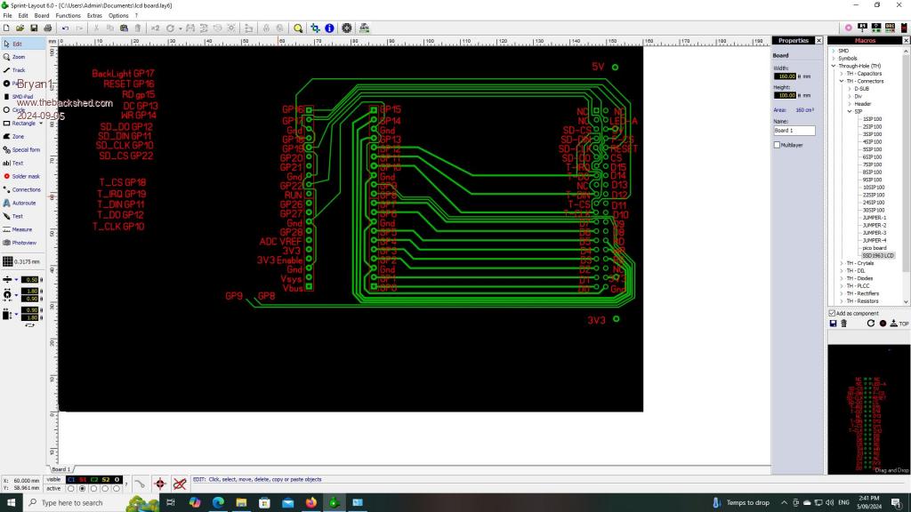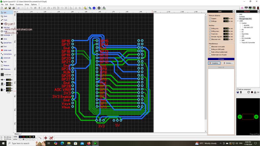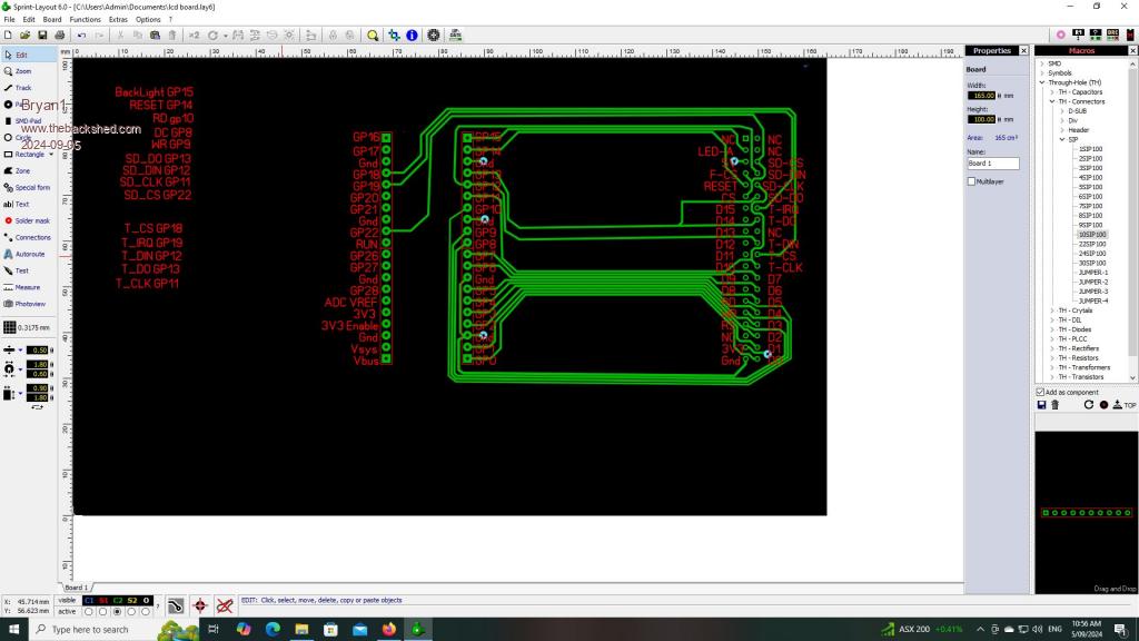 Anyway in the past when I used Sprint I only used single sided boards as I used to mill the the designs in my cnc. So this morning decided it was time to learn to do 2 sided boards and man it easier to route all the pins   Decided to do a DRC check and where I simply placed through hole pads on my saved macros the DRC had a heap of errors saying pads too close   . Anyway made new macros for both the pico and SSD1963 using thru hole pads then pasted them into my design and no errors popped up in the DRC.