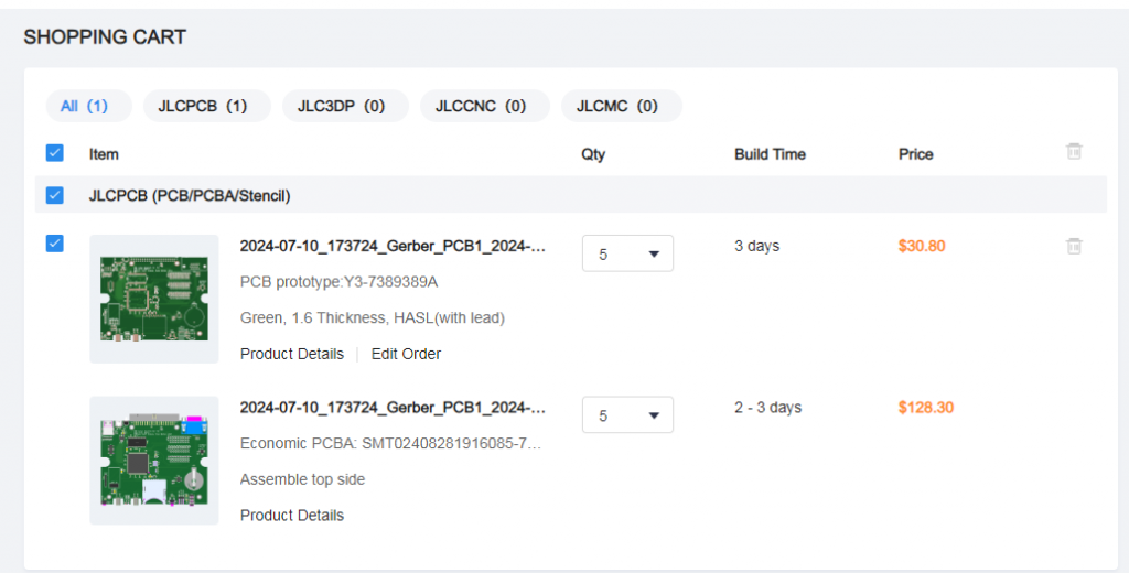 Yes, that's pretty much all there is too it. So long as those two items(the PCB and the SMD assembly) are in your cart, you then just choose your address, choose your shipping method, pay the grand total, and wait for the box to arrive. JLC make it pretty painless to do, and once you have done the order ONCE, you can - if you want - reorder them again at the click of a REORDER button. You don't need to re-upload the gerbers or the BOM/CPL, JLC will reuse those files from your original order. Smoke makes things work. When the smoke gets out, it stops! |