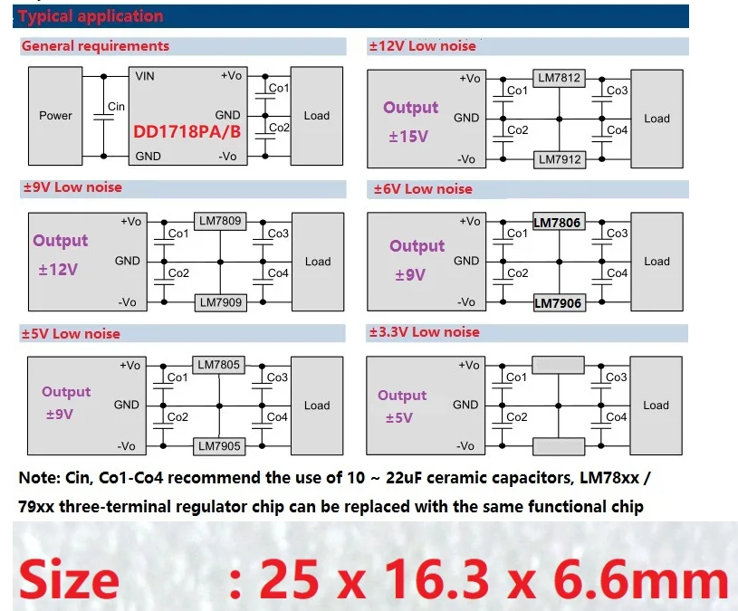 modules are 1" x 1" x 0.5" high. there are a whole load of different input voltage ranges, as well as (i believe) split output voltages. you'll need to have a dig around on ebay to find the exact one toy are after.