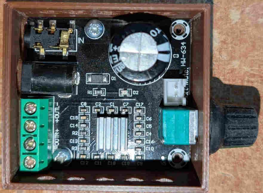 12V barrel jack power and the output seems pretty immune from noise on the supply. Quoted as 15W per channel. Take that with a pinch of salt but still plenty of oomph with no obvious distortion. 3.5mm stereo jack input and screw terminals for the speakers. Works like a treat on the pico using volhout's magic filter. ![]() This is the module and here is the stl for the box 52mm x 48mm x 30mm ampbox.zip Edited 2024-11-02 22:43 by matherp |