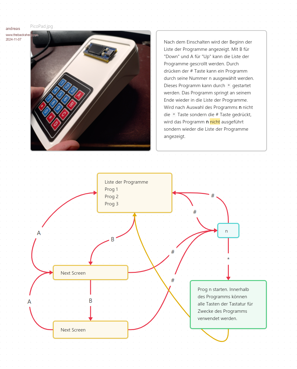 Ok, that sounds good I plan to write a kind of program-selector for my "picopad". The programs will be independent - so they don't need any common variables. Every program will have a final line calling the top-level menu to select the next program to start. the top-level program will just start the program selected. So it will be a large menu and many independent programs without common variables. Sorry for the German text - it was generated with obsidian for myself only but could possibly show what I intend to do? It is a kind of state diagram. ![]() -andreas Edited 2024-11-07 05:22 by andreas |