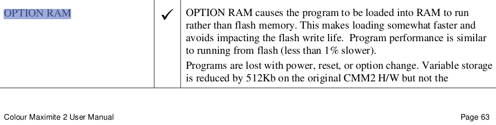 Hello Mick, and what does this mean in my case? When I "run" a program stored in the filesystem A:\ is this a RAM operation or does "run" mean: write something into flash? I write the programs only once but will run them many times - is the running of a program using up flash or is it an RAM only operation? I remember a OPTION RAM instruction on the CMM2 to prevent degradation but the pico has no OPTION RAM, isn't it? -andreas |