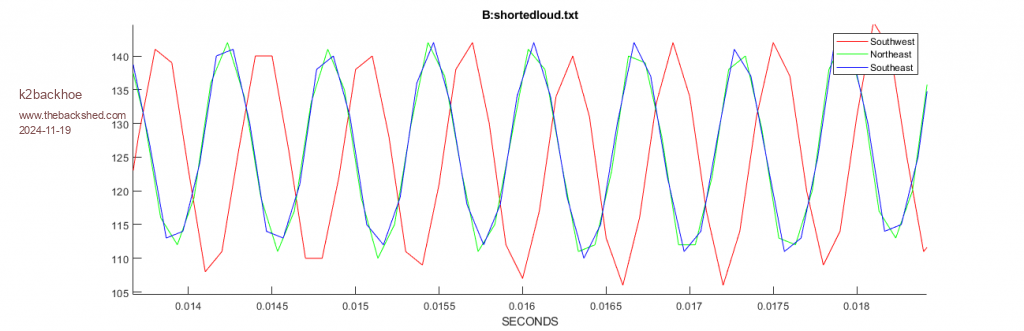 Here is a MATLAB plot of a 1628 Hz signal converted at 10kHz sampling rateon all 3 channels with 2 channels shorted for testing and with the 3 channels offset in time by 0 uSec, 33 uSec and 66 uSec to properly align ADC1 and ADC2: