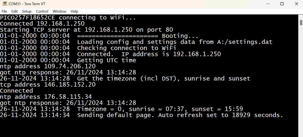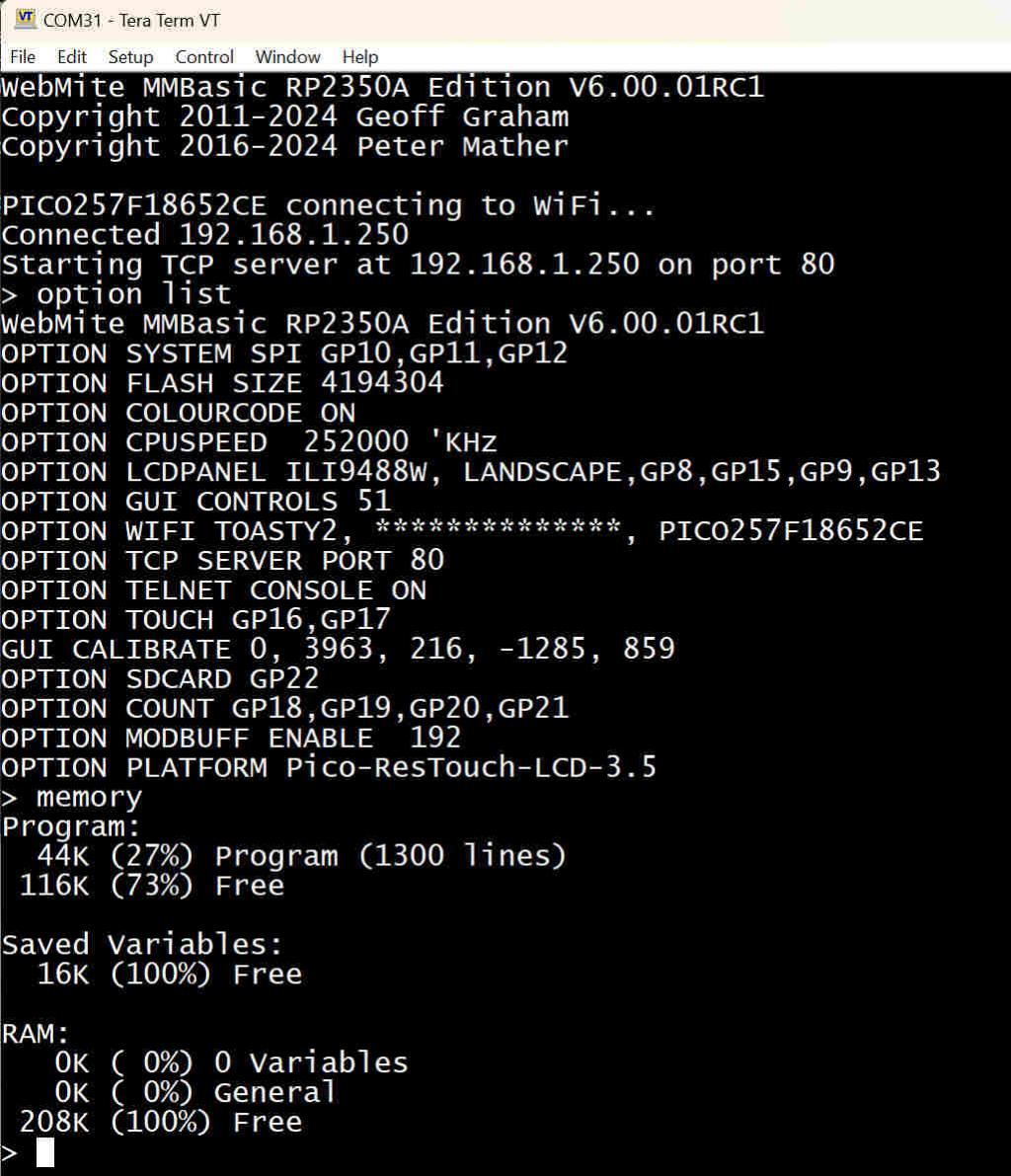 Testing WebMiteRP2350V6.00.01RC1 - very nice! > 2 MB filesystem! > option list WebMite MMBasic RP2350A Edition V6.00.01RC1 OPTION FLASH SIZE 4194304 OPTION CPUSPEED 150000 'KHz > memory Program: 0K ( 0%) Program (0 lines) 160K (100%) Free Saved Variables: 16K (100%) Free RAM: 0K ( 0%) 0 Variables 0K ( 0%) General 208K (100%) Free > flash list Slot 1 available Slot 2 available Slot 3 available > files A:/ <DIR> . <DIR> .. 00:00 01-01-2000 4 bootcount 2 directories, 1 file, 2461696 bytes free > option list WebMite MMBasic RP2350A Edition V6.00.01RC1 OPTION AUTORUN 1 OPTION FLASH SIZE 4194304 OPTION COLOURCODE ON OPTION CPUSPEED 150000 'KHz OPTION DISPLAY 50, 100 OPTION WIFI FritzBox, *********************, PICO93370ED3E2A OPTION TELNET CONSOLE ON OPTION F1 files > flash list Slot 1 in use: "' connect to wifi and get time" Slot 2 available Slot 3 available > list ' connect to wifi and get time Do While MM.Info(IP ADDRESS) = "0.0.0.0" If Timer > 5000 Then CPU RESTART Loop WEB ntp 1,"192.168.178.1" Print "Hello, world!" > run ntp address 192.168.178.1 got ntp response: 28/11/2024 18:19:52 Hello, world! -andreas Edited 2024-11-29 03:22 by andreas |