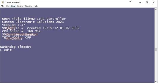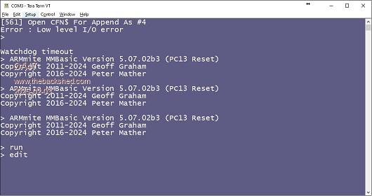 Unfortunately after a week of service in the wild the Armmite F407 PC13 Reset version of firmware lost its Basic Program last night. I still had console control and I was able to AUTOSAVE a copy back on and restore the system. I have looked back through the log file and it last responded at 23:15 last night.