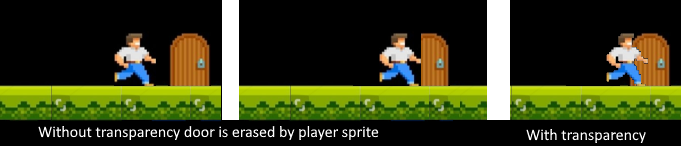 In the images below, you can see what would happen if we didn't use transparency (left image) when the player character starts to erase the door image. So we would draw the player character with transparency, so that we can do not destroy the image behind the player sprite.