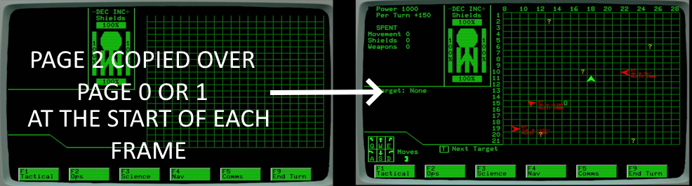 So I add some logic to draw the static background and save it to display page 2 (see image below). Now, whenever I need to clear page 0 or 1, I copy the background from page 2 - and just draw the foreground text and now the draw time is down to a respectable 45ms - or 22 frames per second. Which should be good enough for animations. The ship movement also feels far more responsive.
