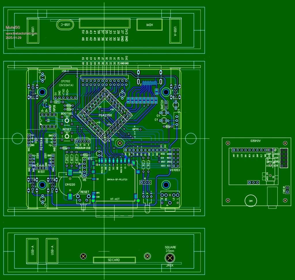 This is something that has been in development for quite a while now, ever since the PGA2350 appeared, in fact. I've kept coming back to it occasionally as it's something of a challenge. :) It's rather like a CMM 1.8. Since changing the USB-C converter for one with 3V3 signals you can even fit an on-off switch if you like. :) There are 20 GPIO pins on the rear panel and a single spare pin inside (there's not enough space for a longer connector, even though it's not a box type).