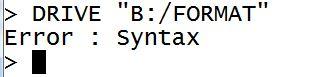 Hi all, the manual says on p37 Shouldn't this also apply to drive B:? Drive A: is pretty full, so I don't want to test it for A:. Of course I can format the SD card in the PC, but that takes more effort. The syntax for formatting also seems a bit unusual to me ...? Any ideas? Michael causality ≠ correlation ≠ coincidence |