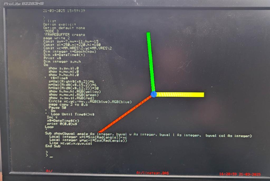 Attached is an update to the CMM2 firmware. CMM2V1.5.zip This brings the MATHS routines up-to-date with the PicoMite. In addition it implements BYVAL and BYREF in function and subroutine definitions. Finally, it implements drawing thick diagonal lines Prior to this release diagonal lines could only be 1 pixel wide. This version implements the ability to specify the line width. Currently horizontal and vertical lines can have a defined width and the x1 and y1 coordinate define the top-left pixel of the thick line. i.e. the line is to the right of the specified position or below it on the screen. This makes no sense for thick diagonal lines where the line should be centered on the origin pixel. To maintain compatibility with existing code you specify this by setting the width as a negative number as in the example below Try the attached Option default none page write 2 Const sw=-7,mw=-11,hw=-15 Const sl=250,ml=220,hl=180 Const xc=MM.HRES\2,yc=MM.VRES\2 Dim integer t=Epoch(now) Dim x$=DateTime$(t) Print x$ Dim integer s,m,h Do show s,sw,sl,0 show m,mw,ml,0 show h,hw,hl,0 ' t$=Time$ s=Val(Right$(x$,2))*6 m=Val(Mid$(x$,15,2))*6 h=Val(Mid$(x$,12,2))*30 show h,hw,hl,RGB(yellow) show m,mw,ml,RGB(green) show s,sw,sl,RGB(red) Circle xc,yc,-mw,,,RGB(blue),RGB(blue) page copy 2 to 0,b Pause 50 ' Do ' Loop Until Time$<>t$ Inc t x$=DateTime$(t) print @(0,0)x$ Loop ' Sub show(byval angle As integer, byval w As integer, byval l As integer, byval col As integer) Local integer x=l*Sin(Rad(angle))+xc Local integer y=yc-l*Cos(Rad(angle)) Line xc,yc,x,y,w,col End Sub |