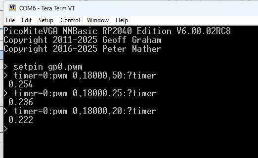 @Phil, It is quite interesting to see that that works, and how fast it is. But it consumes 100% of the MMBasic environment. So the PM is now a quite expensive comparator (1/4 of a LM339 costing $0.08) The idea of using PWM (hardware in pico) and a slower loop is that the pico can run this as a side task (settick controlled). Not as it's main task. I guess that is what Mick is looking for. Volhout PicomiteVGA PETSCII ROBOTS |