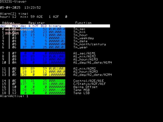 It's not directly related to the question, but I remembered that a few months ago I created (or played around with) some alarm routines for DS3231. Maybe they'll be useful to someone. I'm not sure if I found the right file, but I think the program illustrates the RTC and the alarm status well. Alarm (2) is set with the "A" key. A routine for Alarm 1 is also available. ![]() DS3231view.zip Regards MIchael causality ≠ correlation ≠ coincidence |