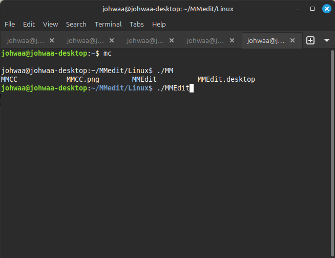 Type in ./MMEdit (or as I did ./MME and then I hit the TAB key). Please note that you need the preceding ./ for bash to find MMEdit since this folder is not included in my PATH.