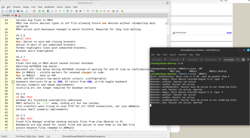 Your terminal will now act as a connector to MMEdit, and any error messages should be displayed in the terminal before MMEdit crashes and closes. Please show us what it is complaining about.