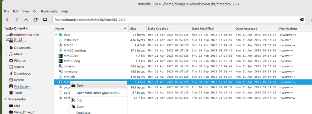 This will download the file MMEdit.zip to your Download directory. You now need to extract the Linux version be selecting the file, right click and choose Extract here