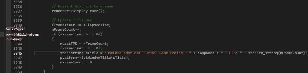 ![]() It was easy You have to change one line in "olcPixelGameEngine.h" from the source ... ![]() Change the text in line 3946 , compile and it's done ![]() Cheers ... Theory is when we know everything but nothing work ... Practice is when everything work but no one know why ;) |