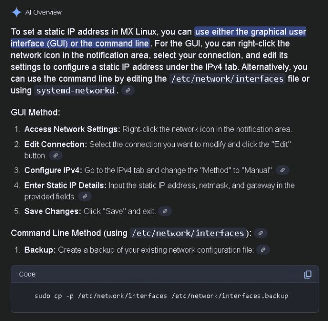 I WOULD like to know how to set a static IP address for MX Linux, but A.I. is very good at telling me how to do that, so that is one thing that A.I. does well....