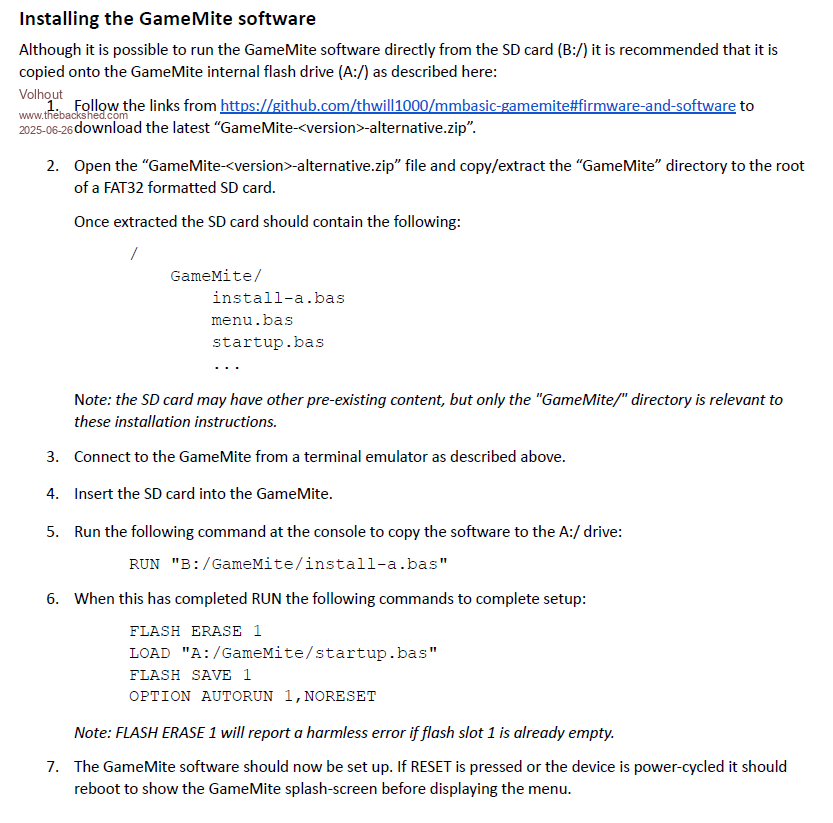 PART #2 Loading the software. First I would like to point everyone to the high quality archive Tom (thwill) made for the Game*Mite. Game*Mite archive At moment of writing, the archive is still based on 5.08.00. We are going to update to 6.00.02. The new 6.00.02 PicoMite firmware (MMBasic) is attached here MMBasic60002.zip Unzip the file. Use the standard method load uf2 files on the RP pico - first Nuke the pico (or pico2) using flash_nuke.uf2. Wait for the reboot. Note : flash_nuke works on both 2040 and 2350. - on the pico program PicoMiteRP2040V6.00.02.uf2 - on the pico2 program PicoMiteRP2350V6.00.02.uf2 Then initialize the platform with: OPTION RESET GameMite For installing the software I used Tom's guide in the Game*Mite user manual. The patched software is attached here. GameMite_1.3_60002_alternative.zip use this procedure (you need an SD card to do this). ![]() After reboot you should have a working Game*Mite with 6.00.02 PicoMite firmware. Let me know if any of you run into trouble, and I'll try to help out. Volhout Edited 2025-06-26 21:19 by Volhout PicomiteVGA PETSCII ROBOTS |