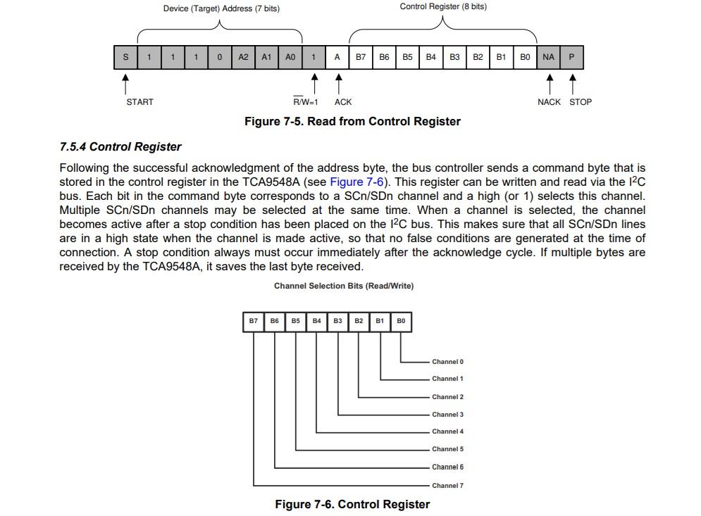 It's easy enough. You are sending one byte (B7-B0) to the address of the TCA. The TCA address is [0]1110[A2][A1][A0] - that's 70 to 77 depending on the address pins. The next bit is 0 to read from it or 1 to write to it. You are selecting a device, so this will be a 1 so that you can write to the device select strobe. The next 8 bits after the ACK (which is automatic) are the device strobes, one per I2C port. So a 1 on B0 will select port 0, a 1 on B1 will select port 1 etc. All non-used ports have their strobes set to 0. It's possible to select two I2C ports at the same time (not sensible for many devices) by setting both their strobe bits high. . Edited 2025-08-01 07:23 by Mixtel90 Mick Zilog Inside! nascom.info for Nascom & Gemini Preliminary MMBasic docs & my PCB designs |
