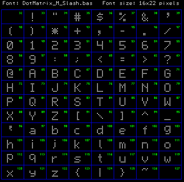 One more font "DotMatrix_M_Slash.bas" , look like this... ![]() /Peter63 |