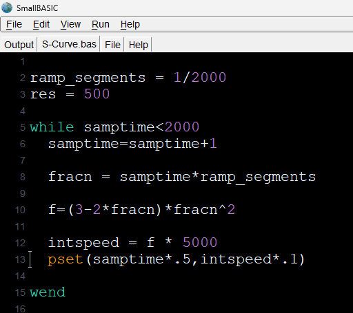 For someone elsewhere, I just had to prove that my S-Curve acceleration routine did in fact work, by generating a plot. Look at any other solution out there because I haven't found one that isn't horrendously complicated ![]() ![]() I know how to do this on the PC using SmallBASIC and so that's what I used. Basic just totally rocks, I don't care about this "non standard" talk because modifications are usually trivial. |