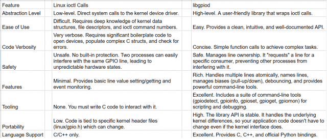 I asked Google Gemini to "Compare Linux IOCTL calls and libgpiod". This gets to the core of modern GPIO interaction in Linux. Comparing raw ioctl calls and libgpiod is like comparing assembling a car from individual parts versus driving a fully manufactured car. Both achieve the goal of "transportation," but the experience, safety, and features are vastly different. In short, libgpiod is the modern, recommended, and vastly superior way for user-space applications to interact with GPIOs. The raw ioctl interface is the low-level kernel mechanism that libgpiod uses under the hood. Here is a detailed comparison: ![]() Why would anyone use IOCTL now? PicoMite, Armmite F4, SensorKits, MMBasic Hardware, Games, etc. on FOTS |
