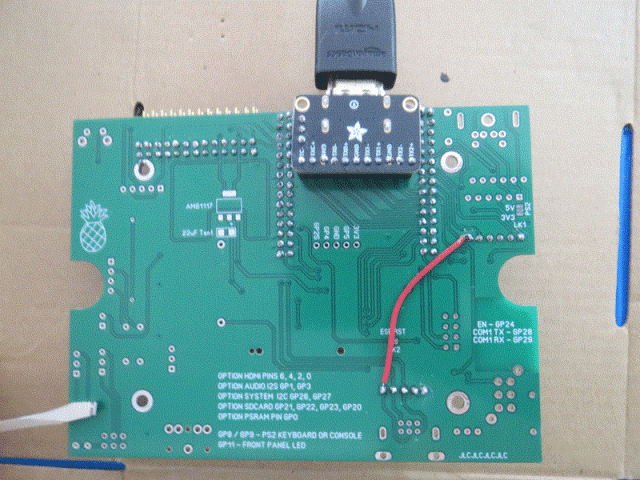 PicoRR works with Mick's GAP2V1 HDMI/DVI PCB for the WeAct RP2350B module with the Adafruit DVI Breakout module (There's now a GAP2V2 ) ![]() The PCBs from JLCPCB arrived yesterday afternoon. I soldered sockets and plugged in a working WeAct module. No joy and no voltage on the modules 3V3 pin. I PMed Mick and he said the layout was designed for the regulator, and the EN pin on the WeAct was tied to GND. I snipped off the EN pin, plugged it in, and it came alive. I still had to supply 5V to the DVI module, so I ran a wire this morning. Voila, output to my HDMI monitor. The Adafruit module will fit under the WeAct, but I put this one on the underside of the board. The only additional thing I want on this board is the RTC. I ran a wire, but it's not seen. I haven't traced that down yet. I may also want to repurpose the CP2102 for an HC-06 bluetooth module. ![]() ![]() This is a beast of a PicoMite. 15MB on drive A:, 6 megabytes of RAM/heap. ~ Edited 2026-03-18 04:56 by lizby PicoMite, Armmite F4, SensorKits, MMBasic Hardware, Games, etc. on FOTS |