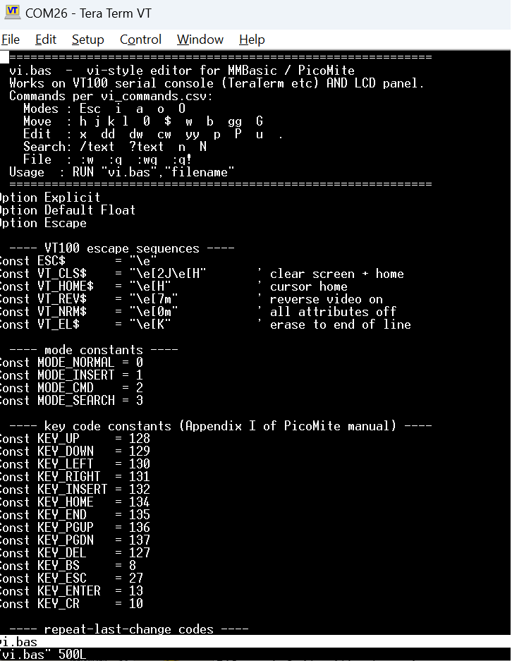 Ok, I asked Claude to do as suggested. I haven't tested except for opening, editing lightly, and closing with and without saving. Works on HDMI screen with TeraTerm console. I don't have a stand-alone setup with keyboard, so haven't tested that. I didn't test LCD version. One program for all: LCD, VGA, HDMI, TeraTerm console. New vi_commands.csv: vi.zip PicoMite, Armmite F4, SensorKits, MMBasic Hardware, Games, etc. on FOTS |