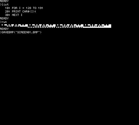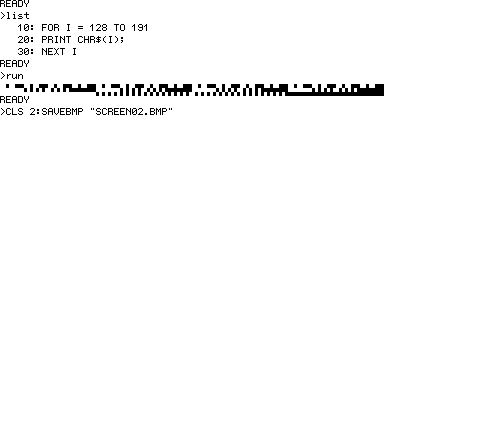 1) I have implemented Graphics Characters for CHR$(128) to CHR$(191) this give compatability for the TRS-80 / System-80 Basic Character set.