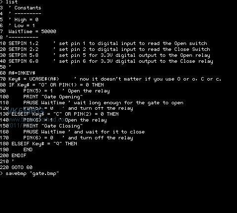 The code was supposed to be testing when Pin 10 (a normally open switch) was High (ie switch closed). Because the code tested for the value 1, it was true any time the switch was open. Just what we didn't want. So that's why VK6MGR saw the messages scrolling past saying the gate was opening. The ELSEIF stopped the code ever checking if Key$ was "C". That explains why pressing "C" had no effect.
