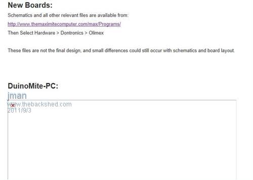 I just got a PM from John. Sorry John, you have sent me two now old URLs. They no longer exist. You need to do this: Schematics and all other relevant files are available from: http://www.themaximitecomputer.com/max/Programs/ Then Select Hardware > Dontronics > Olimex and the new URLs will be exposed. Cheers Don... https://www.dontronics.com |