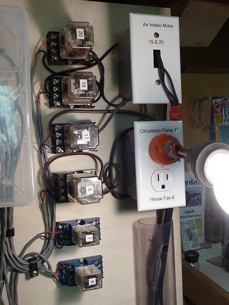 The boiler will be 4’ front to back, 6’ high and 3’ wide. The outer steel jacket contains the boiler water and the inner stove. The inner fire combustion box is about 4’ deep, 4’ high and about 2 ½’ wide. It is accessed through a large door in the front. There is a flue that ports from the front ceiling of the firebox just above the door and goes up and out the back. This exhaust gas tube is 8” diameter ¼” steel and will be within the water jacket below the upper water lever. The exhaust connects outside the back of the boiler to a 25’ tall chimney pipe, also 8” diameter ¼” steel. The entire boiler will be super insulated on the outside of the water jacket with Styrofoam and fiberglass. Over this an angle iron and 1” square steel tubing structure will be built and skinned with exterior painted metal roofing. An insulated removable top will be built also of metal and insulated with Styrofoam. The boiler with insulation and metal siding will be placed on the concrete pad and housed under a wood framed shed of only side walls and roof trusses. The shed will be open on both ends. The shed will be roofed with steel roofing. The roof extending all the way to the back corner of the house so it can be easily accessed during heavy winter snows. Snow depth on the ground here usually builds up to between 6 and 8 feet deep on the flats, much deeper on the building sides where roofs shed their snow. We have 10’ wide decks all around the house on the second floor. These are under the house roof line. On the main floor under the decks we have parking on each side in the front with with 10 to 15 cords of firewood at the back. This wood will be easily accessible to fuel the boiler all winter long. We use a rolling log cart that hauls about 1/6th a cord at a time. The wood fired boiler needs to be well insulated because it is housed outside, albeit under a roof and protected from snow backfilling on each side because of the shed’s side walls. There is an access door on the right side of the boiler’s exterior metal sheeting. Behind this panel are the connections for the electronics, pumps and drain valves. An LCD 16 x 2 line display or perhaps a 16 x 4 line will be installed on the outside of the metal siding next to the stove door. It will display the temperature in the house, the boiler water temperature, whether the circulating pump is running or off, and if the flow control valve is open or closed to the main radiator. Other information can be added if desired. Of course since the system comes with a built in Data logger I can set it up to log each opening and closing of the firebox air intake and each cycle’s duration. This will be helpful in determining efficiency and how long in burn time a full load of wood will last. This should also take into account the ambient outdoor temperature and desired house temperature, but with the addition of an external temperature sensor (outdoor) this could easily be done. I have not yet completed the BASIC program that will run the boiler but many of the sub routines have already been tested. I have not yet put them together as the boiler won’t be built until next summer (June, July & August). The program logic goes something like this: If the temperature in the house is below that desired, and if the boiler water temperature is less than 170 degrees F., then open the air intake at the front of the firebox below the door and for the first five minutes turn on the 12 volt 80mm fans which serve as blowers (old recycled computer power supply fans). These should bring the smoldering fire up to temperature quickly. Then, as the water temperature is still not up to 180 degrees F, the fire will continue to burn without the benefit of fans until the water in the boiler is 180 degrees. When the water temperature is over 150, and the house is colder than desired, the water circulation pump will operate continuously, probably all winter long. In addition to heating the house, the boiler water also circulates across a heat exchanger at the electric hot water heater. This will help heat the hot water supply in the house saving on electricity. Our household hot water already circulates in a continuous thermal wicking loop. This loop returns the hot water back to the bottom of the hot water heater. This is so we can have hot water almost instantly at any faucet, even on the upper level of the house. There will be either a hot water merge control to mix it with cold if the hot water temperature gets over 130 degrees F, or perhaps there should be a flow control solenoid at the water heater to prevent over heating the household hot water. Without such a control the household hot water would get too hot for use in the home. This is usually done with a temperature merge control, but in our hose with a thermal wicking loop such a merge valve won't work. If it turns out that this situation often happens in conjuction with an over warm house, then perhaps the best answer in these cases would be to just turn off the boiler water flow to the entire house by turning off the circulating pump. The schematic only shows two Temperature Sensors, one in the boiler water and one in the house, but another might be a good idea at the household water heater. Others might be added if additional heating zones are desired. Our house will very likely only need a single radiator. An outdoor Temperature sensor could be useful too in the spring and fall as the need for the entire system waxes and wanes as the weather gets warmer and cooler. Additional heating zones. All it would take to add an additional heating zone from the electronic point of view is another temperature sensor, a pin for another fan relay, and a pin for a flow control valve to the extra radiator in that zone. This means each additional zone requires only three I/O pins. Of course it would require an extra radiator and running additional tubing too. The fan in the house that could blow air across the r