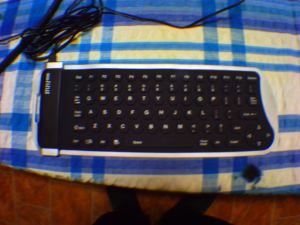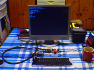 Et Al, Many thanks for all the input. Anyway I recieved my Mini-Duinomite and brought it up on USB. Today my flexible keyboard arrived so I used the black USB-PS2 adapter that came in the pack and borrowed a HP display off a son and wired up a Power supply. Everything came up and it all works a treat. No Problems what so ever. Duinomite with both keyboard adapter and VGA connector. Tight but no problems. It's a small keyboard. The setup running while I check everything was OK. Sorry for the not so good photos. The keyboard is a TomTop TASJ05 USB/PS2 flexible keyboard I found on Ebay. It has ST1212 written on the keyboard's left side as well. Hope it helps. Many thanks to Geoff and Ken for the ability to run the keyboard. |