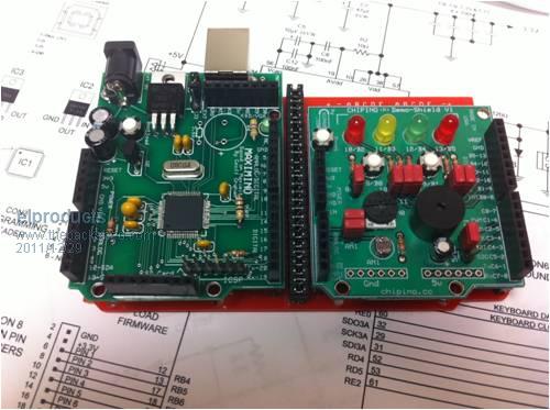 As you can see it plugs directly into a side by side shield and can easily run a CHIPINO (Arduino compatible) Demo Shield.